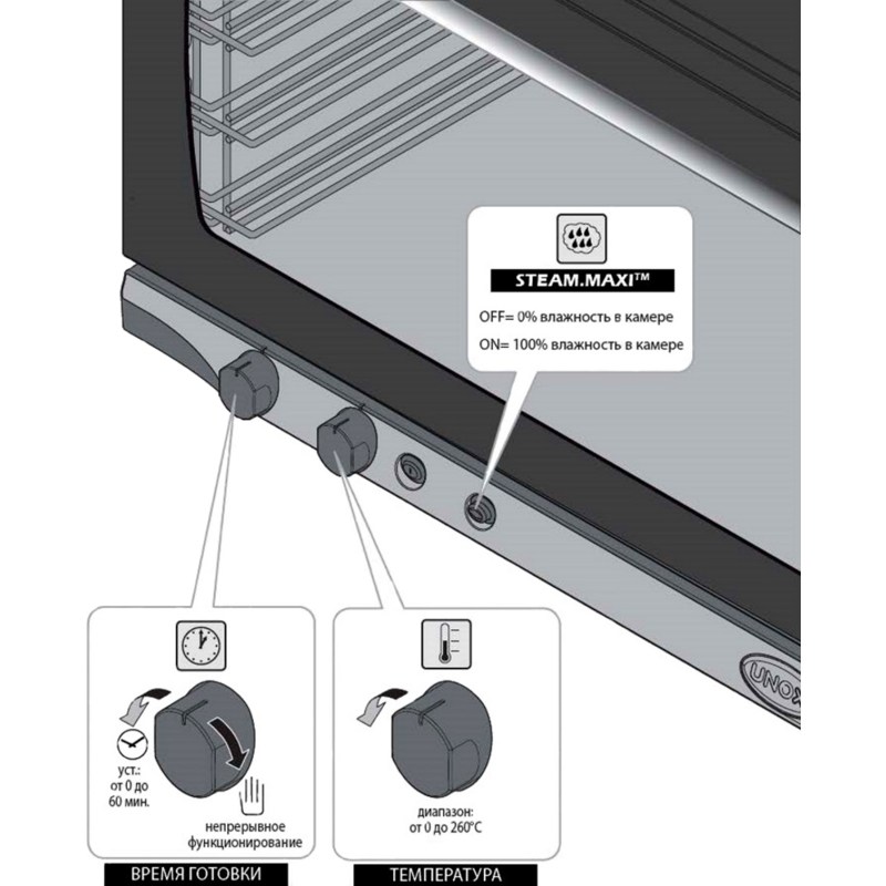 Механическая панель управления с ручным регулированием времени приготовления, температуры и степени пароувлажнения — простота и надёжность, не требующие сложного обучения персонала.