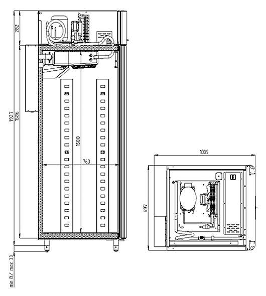 Каталог оборудования Холодильное оборудованиеШкафы холодильныеСпециализированные холодильные шкафыШкаф холодильный для хлебопекарных производств Polair CS107-Bakery Br со стеклом (Тип 1) Шкаф холодильный для хлебопекарных производств Polair CS107-Bakery Br со стеклом (Тип 1) Код товара: 062-622 Поделиться: WhatsAppTelegram СравнитьДобавить в КПВ избранное 0 414 545 ₽ В корзину 0 шт Под заказСамовывоз сегодня бесплатно Взять в кредит Купить в лизинг Получить консультацию в WhatsApp Описание Характеристики Отзывы 0 Инструкции 5 Шкаф холодильный для хлебопекарных производств Polair CS107-Bakery Br со стеклом (Тип 1) предназначен для создания оптимальных условий хранения и расстойки заготовок из теста на предприятиях общественного питания и торговли. Цельнозаливной корпус выполнен из нержавеющей стали, дверь — стеклопакет. Оборудование стабильно работает при температуре окружающей среды до +40 °C. В комплект входят 20 пар направляющих размером 400×600 мм. Особенности: Широкий функционал: охлаждение, замедление ферментации, хранение, регенерация, брожение и расстойка Динамическое охлаждение с мягким обдувом без заветривания и автоматическая оттайка с системой испарения конденсата Панель управления с 5" дисплеем: контроль температуры, влажности (регулируется от 60 до 95 %), скорости вентилятора и времени, а также возможность создания и сохранения программ Встроенный ультразвуковой увлажнитель (необходима система водоочистки и канализация) Эргономичная конструкция: верхнее расположение агрегата, распашная дверь со стеклопакетом, механизм самозакрывания, педаль для открытия, съёмные направляющие и легко заменяемый уплотнитель с магнитной вставкой Дополнительная защита: пластиковый бордюр по периметру камеры для предотвращения повреждений от тележек Простота ухода: штампованное углубление в дне корпуса для сбора загрязнений Экологичный хладагент R290 и энергоэффективность: потребляемая мощность — 0,55 кВт (охлаждение), 0,9 кВт (нагрев) Толщина стенки корпуса — 43 мм Polair CS107-Bakery Br со стеклом (Тип 1) — надёжный и многофункциональный шкаф, который обеспечивает полное управление процессами брожения и расстойки теста. Современная система охлаждения и увлажнения, продуманная конструкция и удобное управление делают его оптимальным решением для пекарен и кондитерских, стремящихся к стабильному качеству и высокой производительности.Изображение товара, представленного на фото, может отличаться от его фактического вида. Показать все Габаритные размеры697×1005×1960 ммДиапазон рабочей температурыот -10 до +40 °CДлина697 ммШирина1005 ммВысота1960 ммОбъём700 лКол-во дверей1 Тип двериСтеклянная Уровень влажностиот 60 до 95 %Направляющие под EN 40*6020 Расстояние между направляющими60 ммХолодильный агрегатВстроенный Тип оттайкиАвтоматическая Тип охлажденияДинамический ПодсветкаЕсть ХладагентR290 Вес нетто180 кгБрендPolairВсе специализированные холодильные шкафы Из нержавейки Оставить отзыв Еще никто не оставил отзыв на этот товар Схема POLAIR CS107 Bakery Br.jpgИнструкция на POLAIR CS107 Bakery Br.pdfБрошюра на хлебопекарное оборудование POLAIR.pdfДекларация о соответствии.pdfСертификат соответствия.pdf Похожие товары Перейти в каталог Под заказ 207 942 ₽ Шкаф холодильный HURAKAN HKN-MA350 для созревания мяса Под заказ 405 450 ₽ Шкаф холодильный для хлебопекарных производств Polair CS107 Bakery Br черный, со стеклом (Тип 1) Под заказ 118 831 ₽ Шкаф холоди