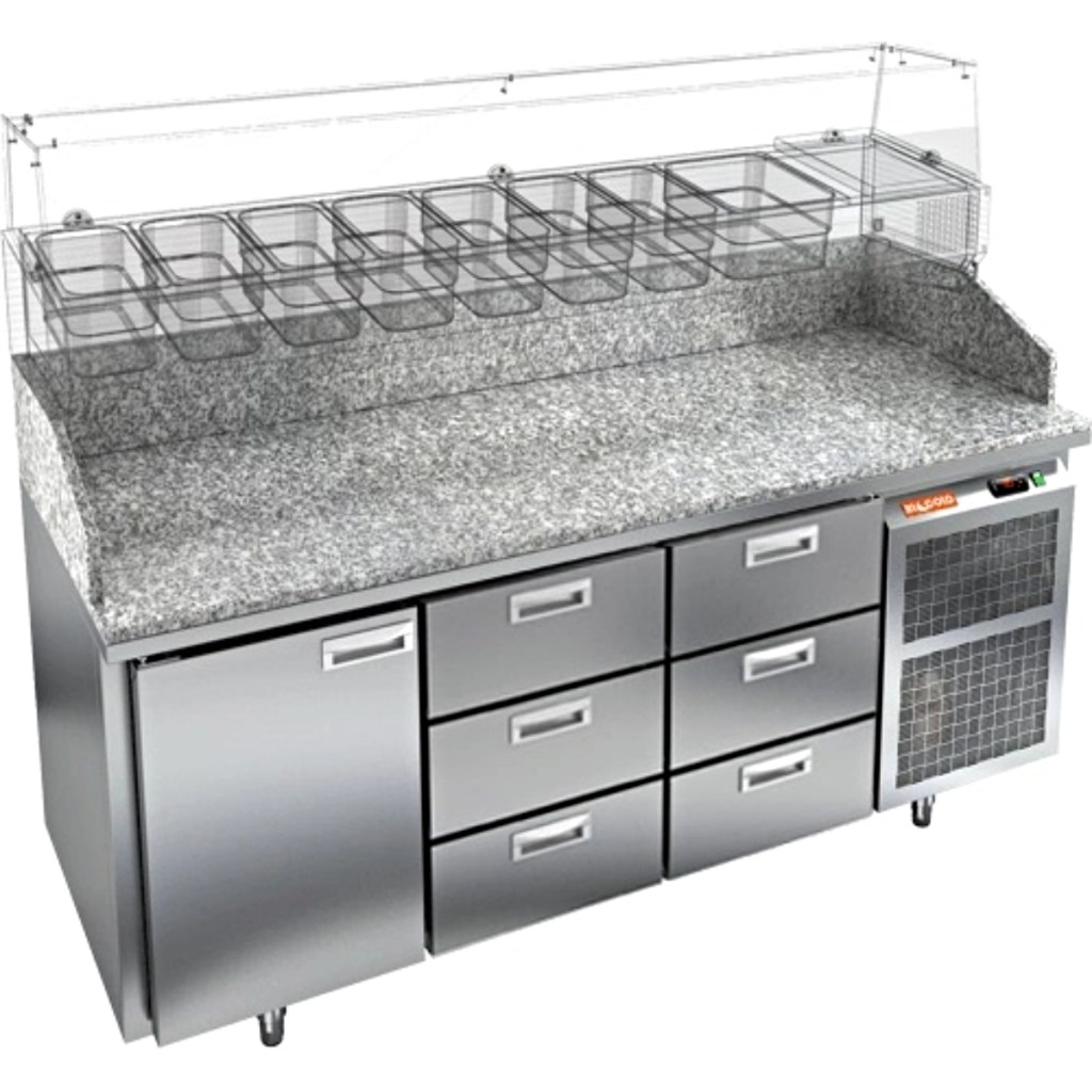 HiCold PZE3-133/GN камень— это надёжный и функциональный холодильный стол для пиццы, который сочетает прочность, эргономику и эффективное охлаждение. Благодаря гранитной столешнице, корпусу из нержавеющей стали, двум глухим дверям и двум выдвижным ящикам он станет универсальным решением для профессиональной кухни.