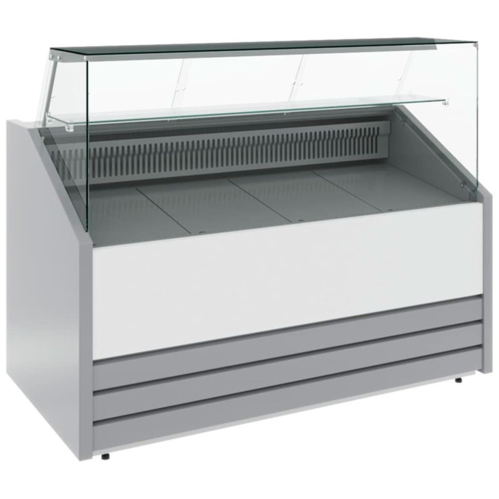 Конструкция витрины включает накопитель для продуктов, поддон для выкладки и регулируемые ножки высотой 20–35 мм. Столешница, зона выкладки, боковые и нижняя фронтальная панели, а также обшивка светильника и испарителя выполнены из стали серебристого цвета.Декоративная передняя панель — из стали, держатель стекла — из нержавеющей стали. Боковины и столешница имеют пенополиуретановую теплоизоляцию.