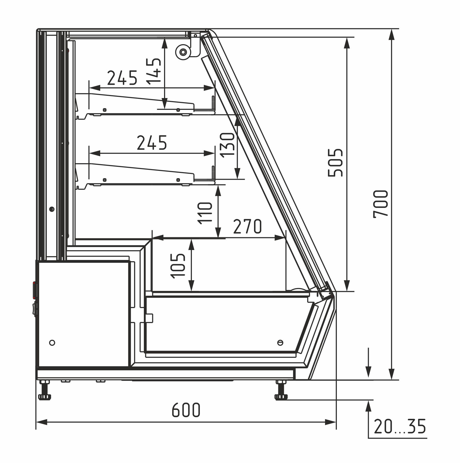 • Высота выкладки продуктов: до 150 мм на нижнем поддоне, до 100 мм на полках.